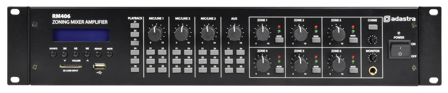 Il Adastra RM406 è un mixer-amplificatore di zona con una sezione di potenza classe D da 6 x 40W, compatibile con altoparlanti da 100V o 4/8 Ohm. Ogni zona può essere monitorata dal pannello frontale tramite un’uscita cuffie con controllo del volume. Dispone di 3 ingressi mic/line, 1 ingresso aux e un lettore USB/SD/FM integrato con ricevitore Bluetooth, che può essere commutato su ciascuna delle 6 zone in modo indipendente. Il canale Mic 1 ha un override variabile e ogni ingresso microfono ha un’alimentazione phantom commutabile. Un chime master con volume può essere utilizzato per chiamate e avvisi.