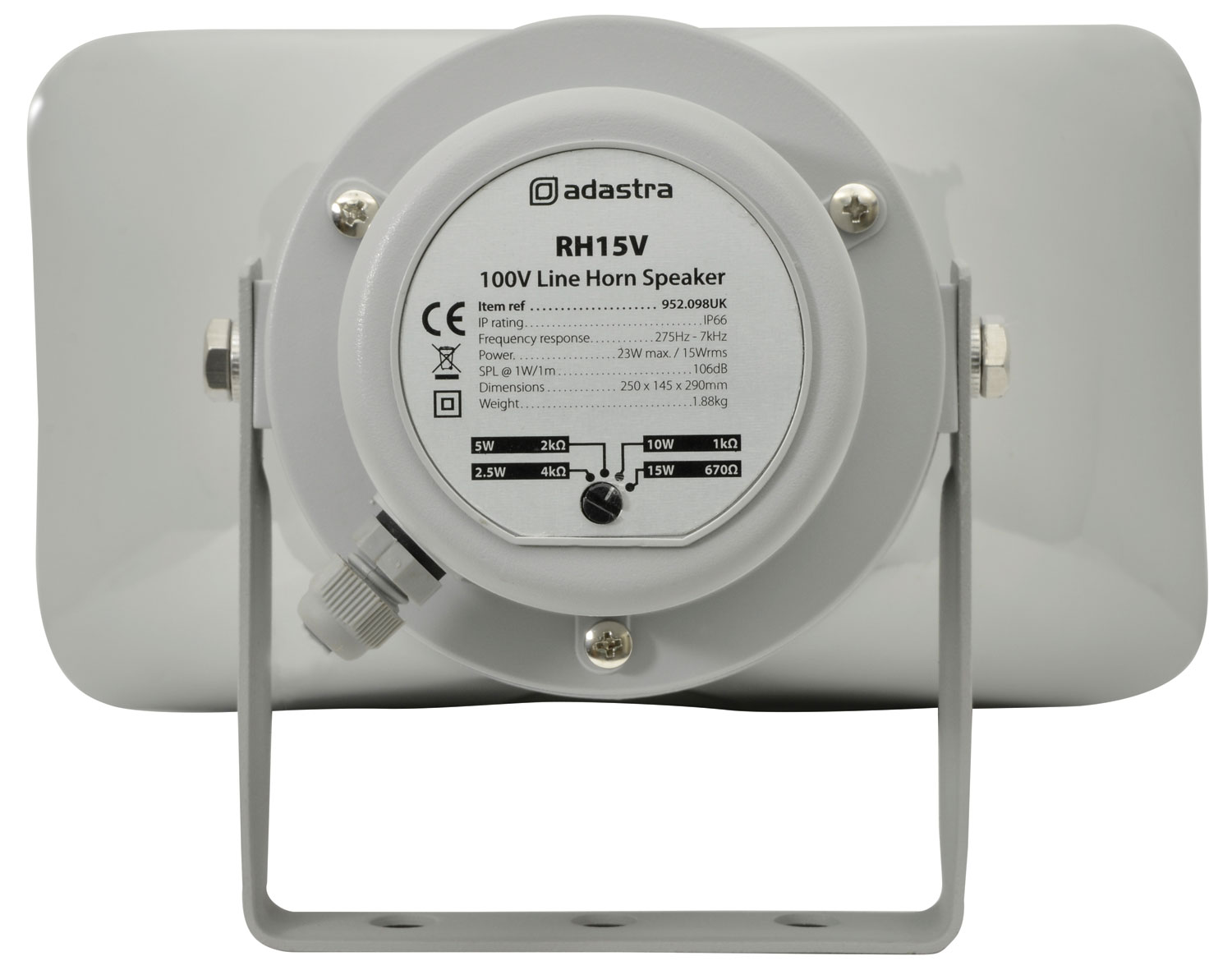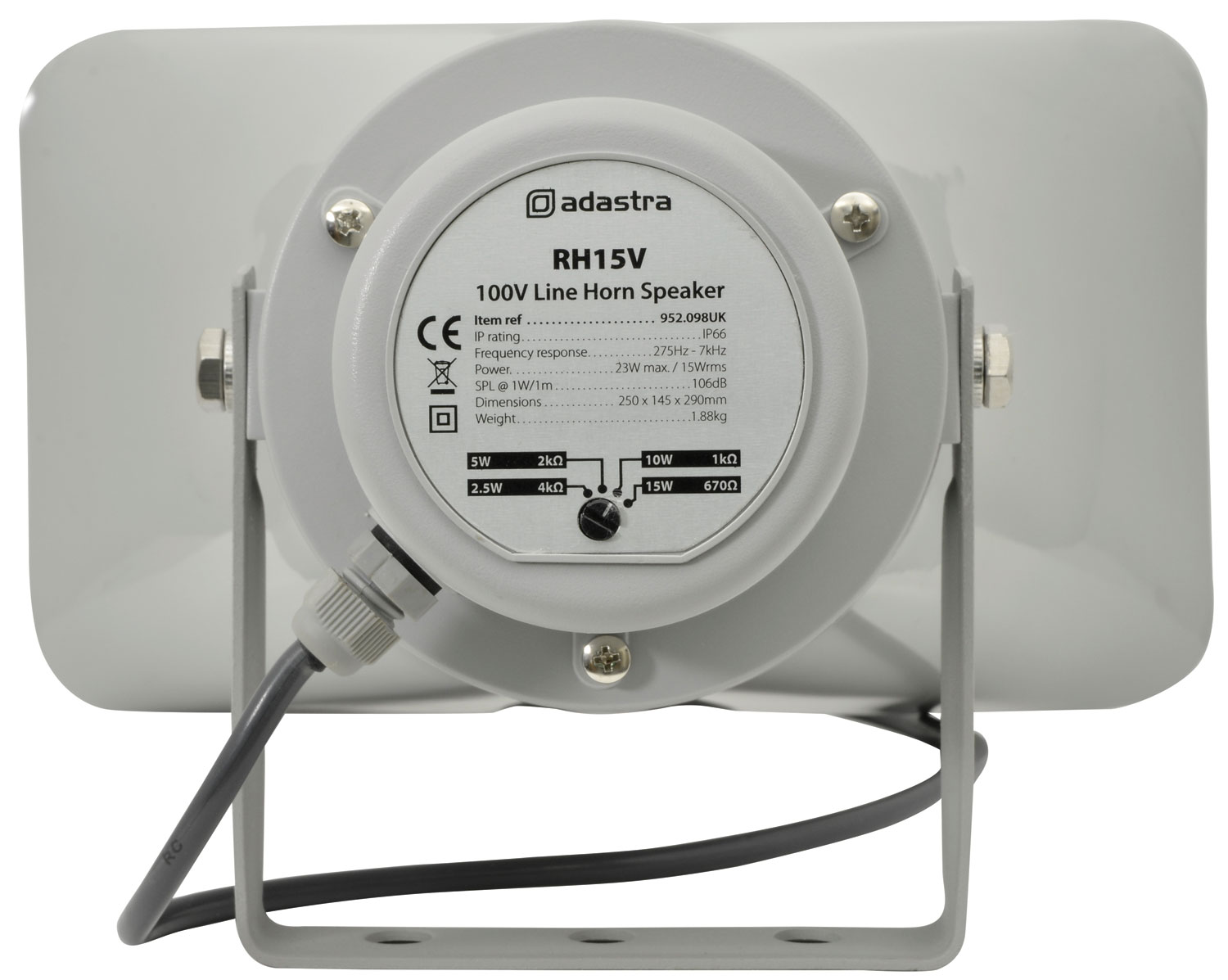 I diffusori a tromba RH Series di Adastra offrono un’eccezionale diffusione del suono grazie al trasformatore integrato a 100V con diverse impostazioni di potenza. La struttura in materiale ABS ad alta resistenza garantisce la massima protezione contro danni fisici e atmosferici. Il design rettangolare e il caricamento reflex assicurano una diffusione sonora efficiente e diretta su ampie aree.