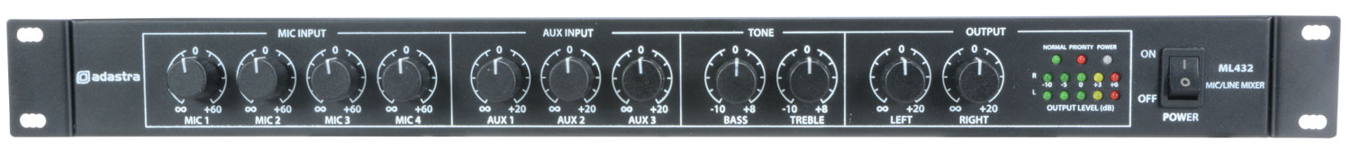 Il Mixer Rack 1U Mic/Line di Adastra è progettato per offrire una soluzione versatile per sistemi audio installati. Con 4 ingressi microfonici bilanciati e 3 ingressi ausiliari stereo, è perfetto per gestire diverse sorgenti audio.