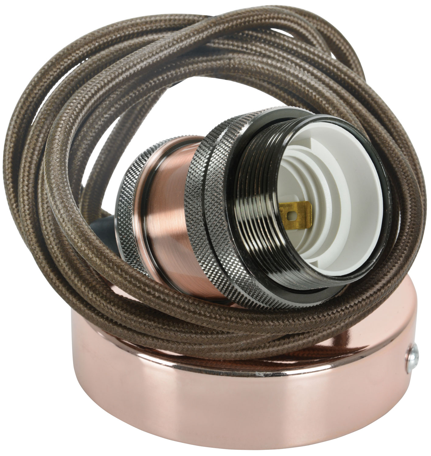 I set di cordoni pendenti decorativi comprendono un portalampada E27 con copertura in alluminio placcato, rosone in acciaio placcato con blocco terminale interno e un cavo principale intrecciato in nylon da 1.8m. Il cavo può essere tagliato alla lunghezza desiderata e riconnesso nel rosone secondo necessità. Ideale per installazioni con lampadine LED a filamento in stile vintage per creare un’illuminazione retrò.